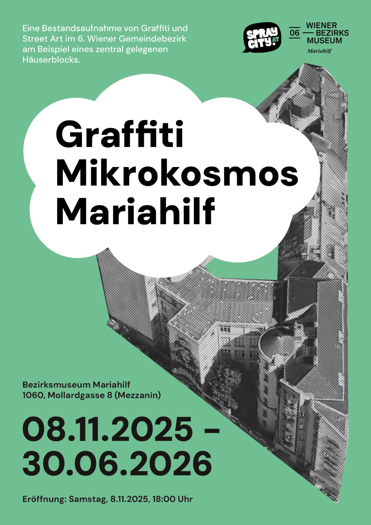 Ob kleine Tags, kunstvolle Pieces oder großflächige Murals: Mariahilf ist ein fruchtbarer Boden für die unterschiedlichsten Erscheinungsformen zeitgenössischer Graffiti-Kunst. Oft reicht ein Blick vor die eigene Haustür, um die vielfältige Graffiti-Welt zu erforschen. Die Ausstellung lädt zu einer Entdeckungsreise durch den öffentlichen Raum ein – mit dem Bezirksmuseum als Ausgangs- und Mittelpunkt. Im Fokus steht nämlich der Häuserblock des Museums selbst, der die Vielfalt und Dichte der Graffiti-Community im Bezirk exemplarisch widerspiegelt. Gezeigt werden Fotografien von Graffiti, die rund um das Museum aufgenommen wurden. Der urbane Mikrokosmos wird ins Innere des Hauses geholt, dokumentiert und analysiert. So wird das Bezirksmuseum zum temporären Ort der Auseinandersetzung mit einer oft kontroversiell diskutierten und teilweise sehr kurzlebigen Ausdrucksform, die den urbanen Raum maßgeblich prägt.