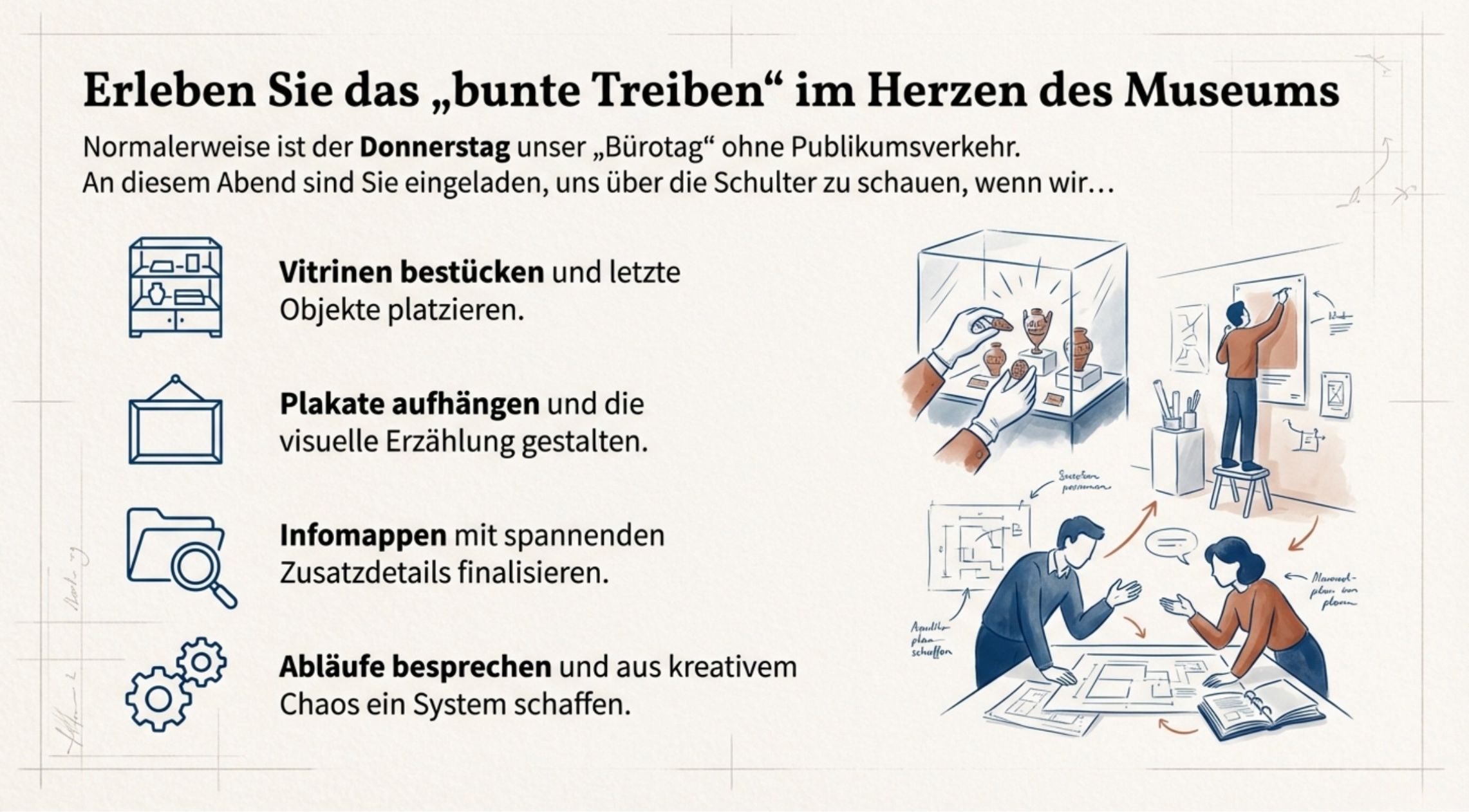 Haben Sie sich schon einmal gefragt, wie aus einer bloßen Idee eine fertige Museumsausstellung wird? Normalerweise ist der Donnerstag im Bezirksmuseum Rudolfsheim-Fünfhaus der sogenannte „Bürotag“ – eine Zeit für Recherche, Organisation und Besprechungen ohne Publikumsverkehr. Doch für einen Abend öffnen wir die Türen und lassen Sie hautnah dabei sein!