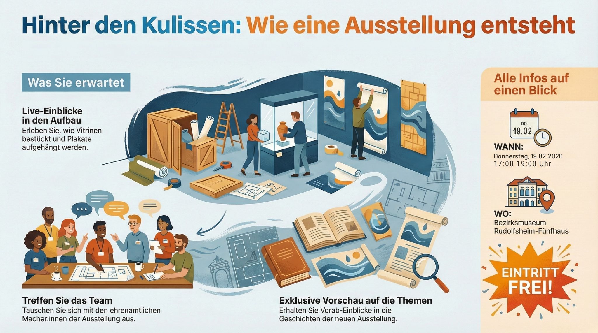 Unter dem Motto „Behind the scenes – Wie eine Ausstellung entsteht“ laden wir Sie ein, live bei den Vorbereitungen für unsere neue Sonderausstellung „Wasser in Rudolfsheim-Fünfhaus – Natur und Kultur“ dabei zu sein.